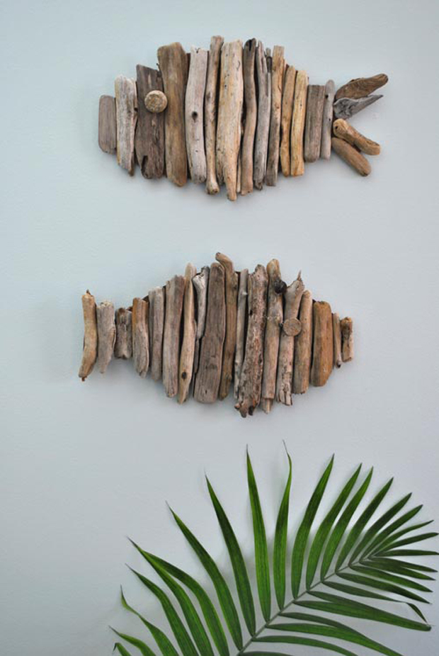 Puedes hacer estos pequeños peces decorativos con ramas o palos. Dibuja un pez en una hoja blanca y úsalo como molde para pegarlos.