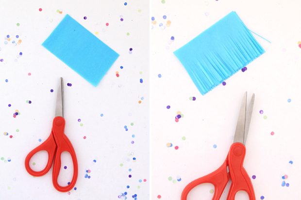 Corta pequeños rectángulos de papel y hazle algunos flecos sin llegar al extremo.
