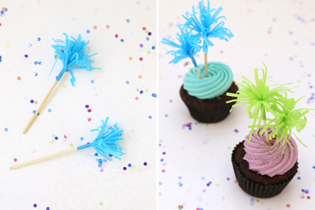 Para la segunda opción haremos unos toppers muy divertidos, inspirados en fuegos artificiales. En este caso usé papel volantín.