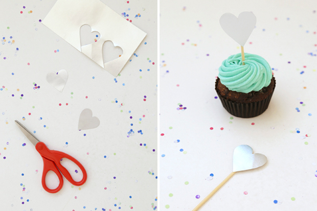 Simplemente corta una figura con forma de corazón y pégala al extremo de la brocheta. Fácil y muy decorativa.