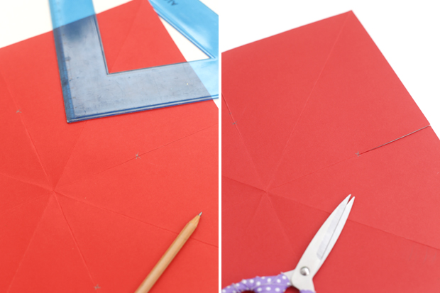 Marca un punto en la línea que une el centro con uno de los lados. No debe quedar justo a la mitad, sino 1 o 2 centímetros hacia el lado del borde. Haz un corte hasta la marca.