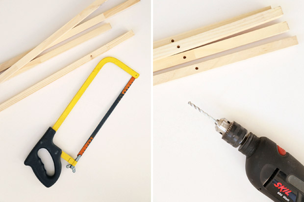 Luego, con el taladro, haz un agujero en cada palo, a unos 15 o 20 centímetros del extremo superior. Si es necesario, lija los palos para eliminar astillas.