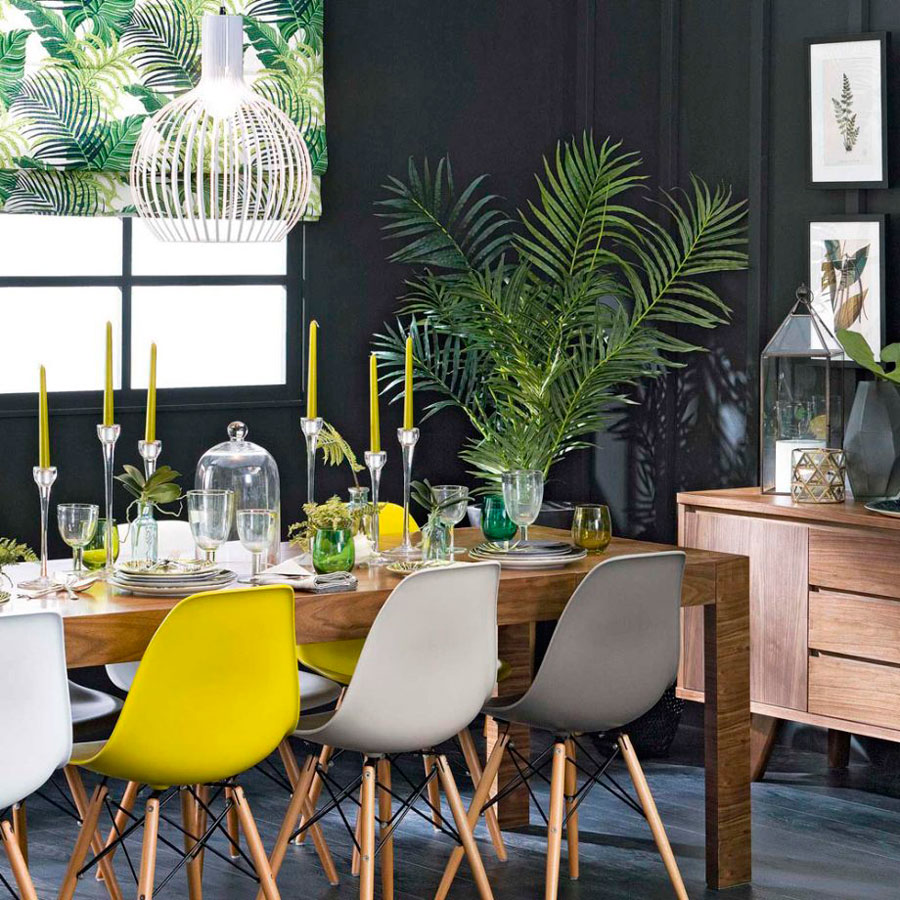 En lo que respecta a los colores, aunque los tradicionales son el verde y el rosa, con licencias al turquesa, naranjo o fucsia, la verdad es que en las aplicaciones que vamos a ver ahora puedes conseguir efecto tropical casi con cualquier color (¡incluso negro!). De hecho, me atrevería a decir, que esta desconexión con los colores tradicionales o, más bien, esta flexibilidad a la hora de mezclarlos, es una de las patas fuertes de la tendencia.